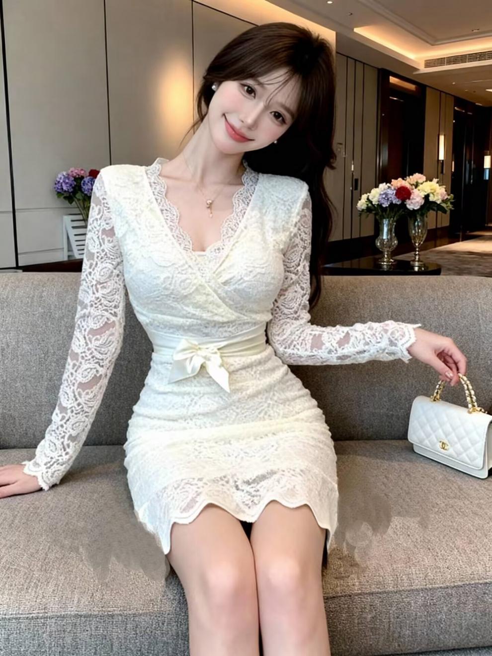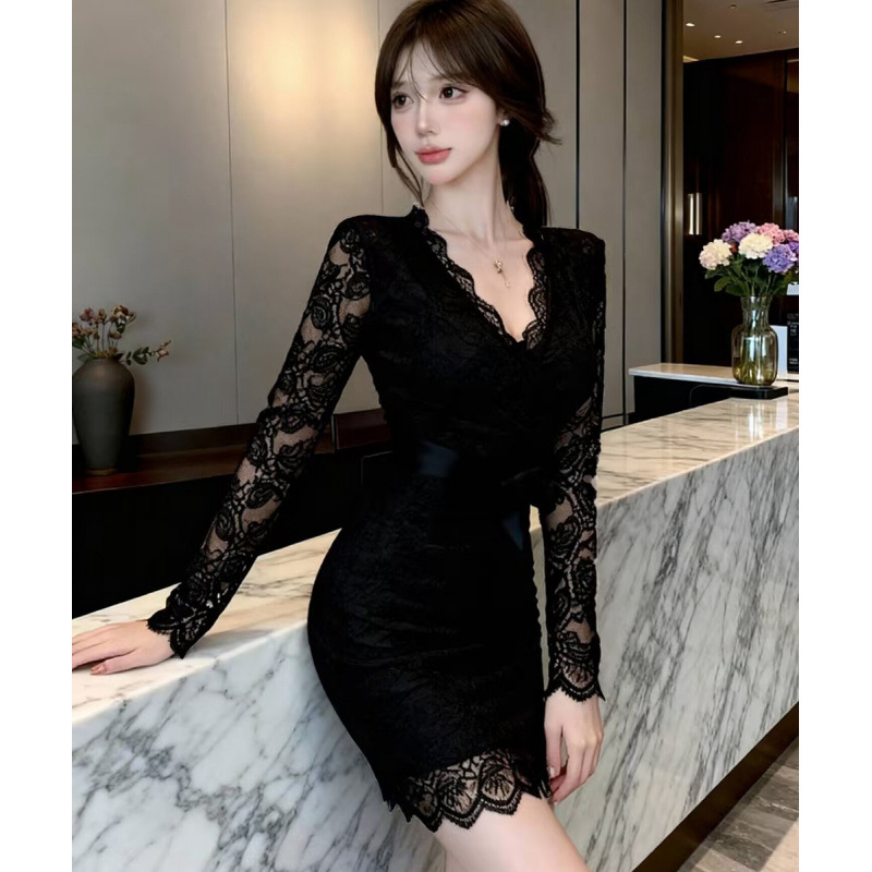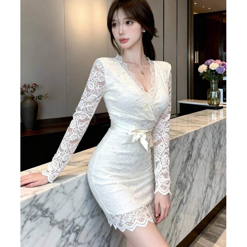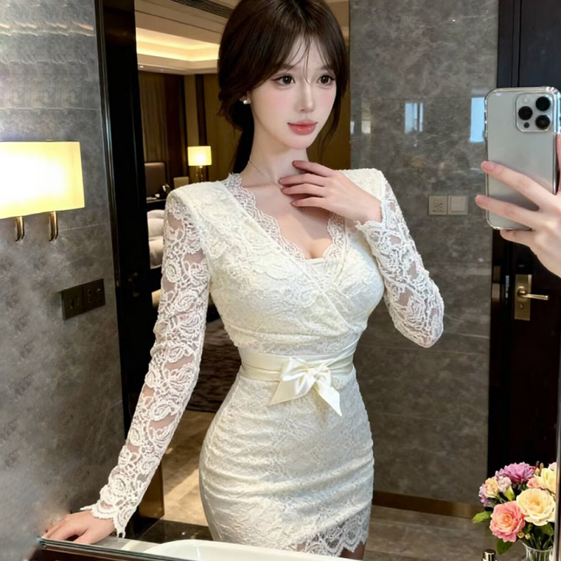 婚禮演奏 性感V領鏤空蕾絲包臀洋裝