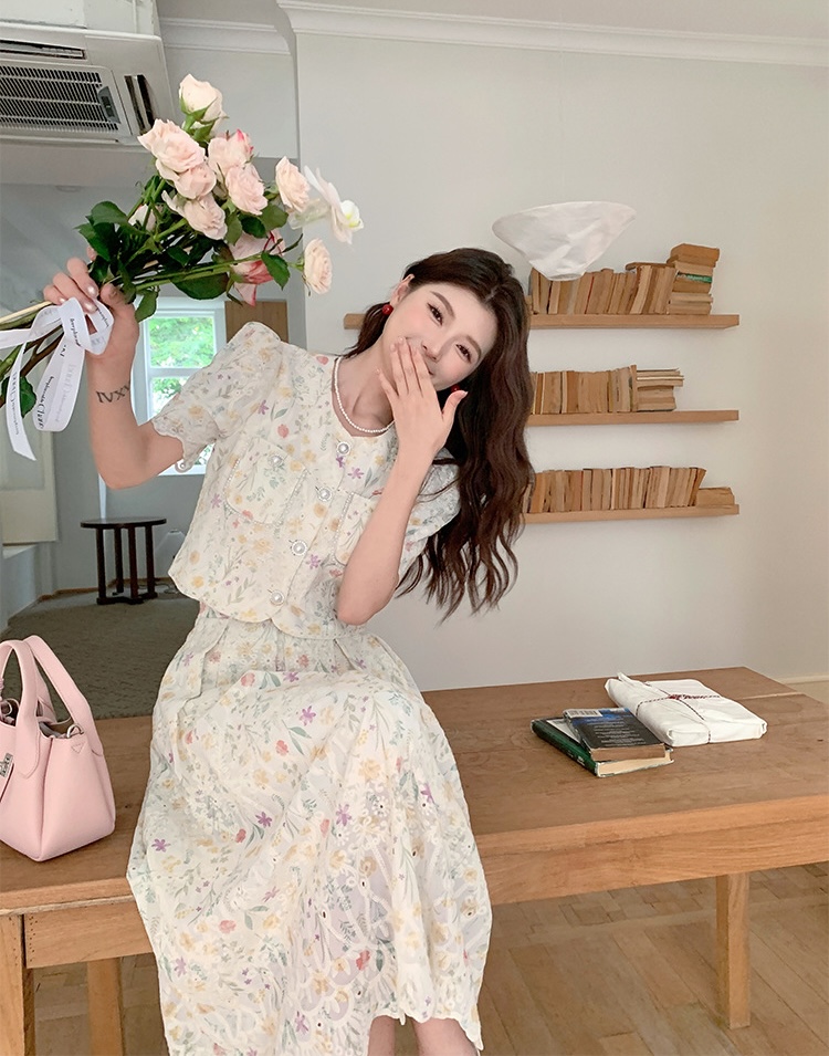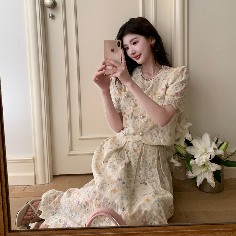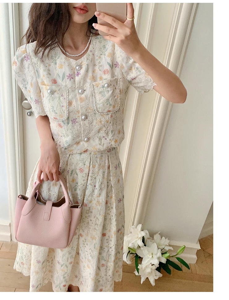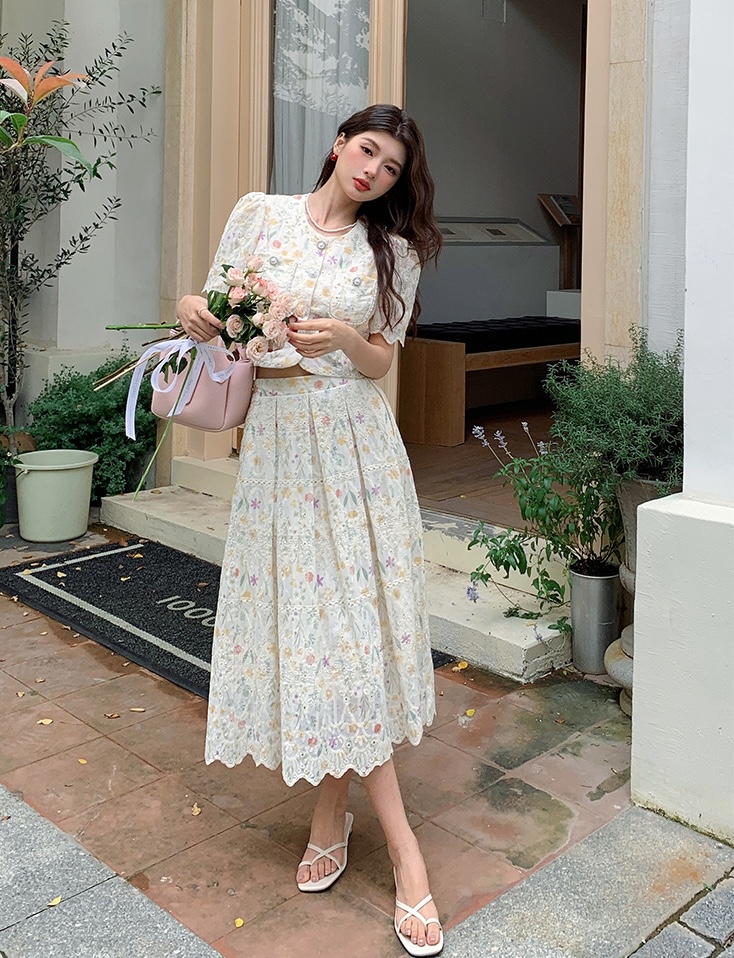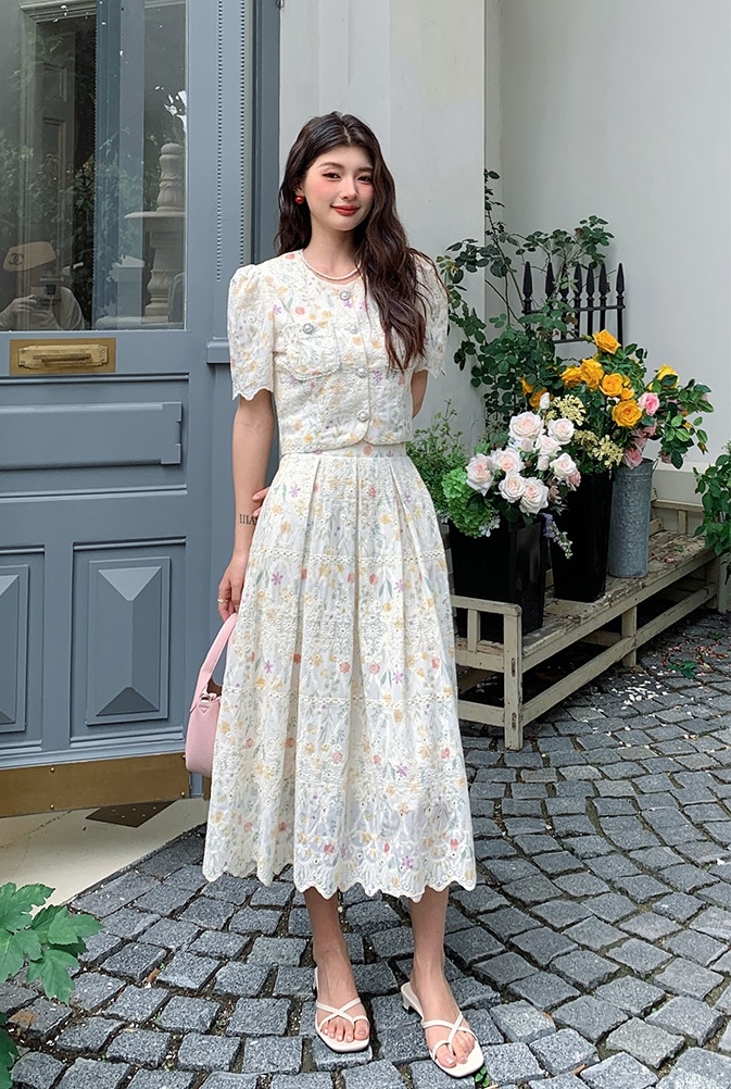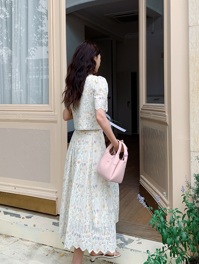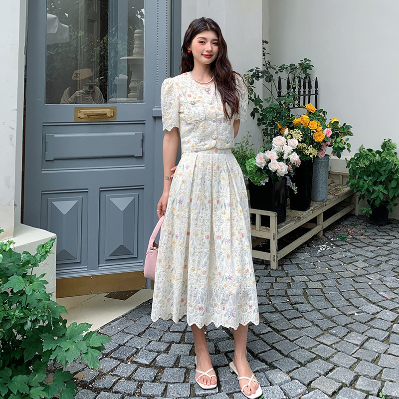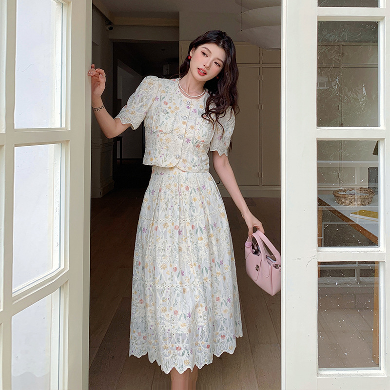 高級定制氣質小香風刺繡雪紡碎花套裝兩件套花邊的袖口 設計感十足小碎花的圖案 真的很好看簡約的裙擺 自然成型上身效果 chao 好