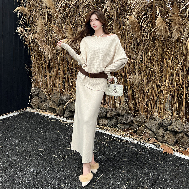 / 氣質時尚套裝2025秋冬新款寬鬆女裝針織衫鬆緊腰半身裙配腰帶