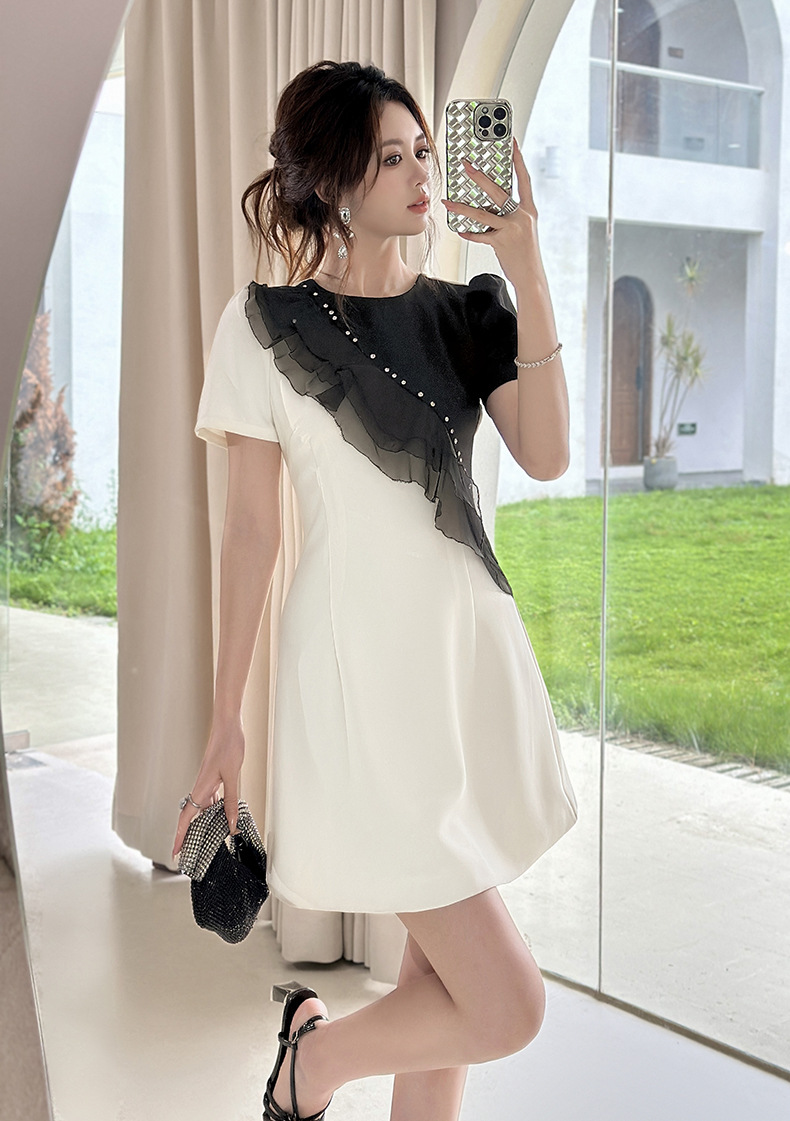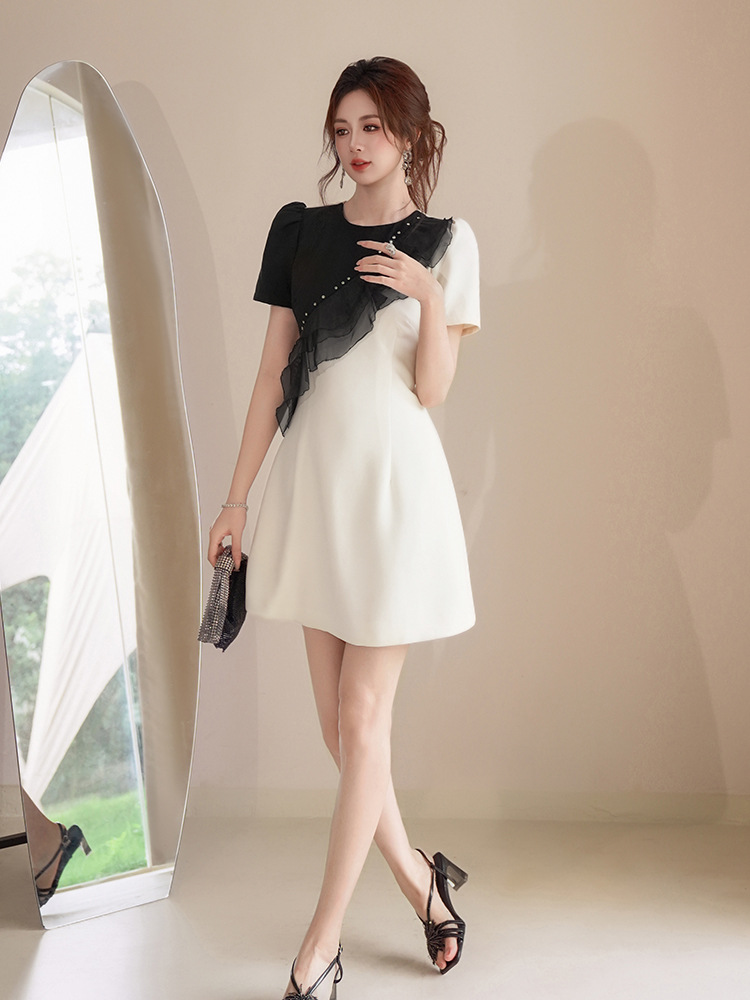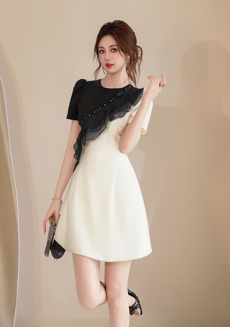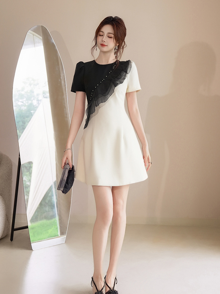 款式:連衣裙 顏色:黑杏色 面料名稱:梭織料+歐根紗 主布:95%聚酯纖維 5%氨綸 配布:95%聚酯纖維 5%氨綸 荷葉:100%聚酯纖維 裡布:95%聚酯纖維 5%氨綸 其他:有內裡