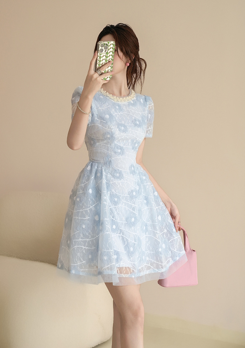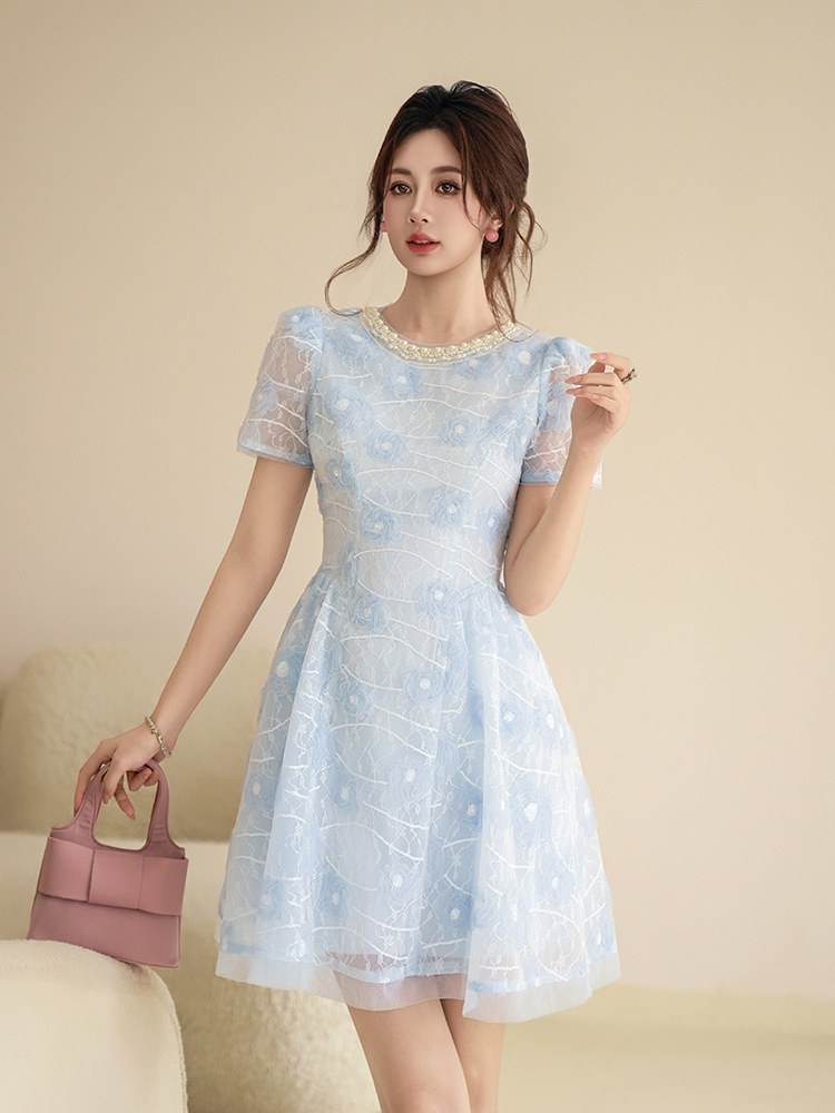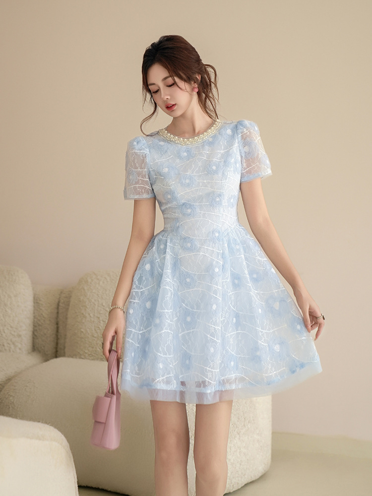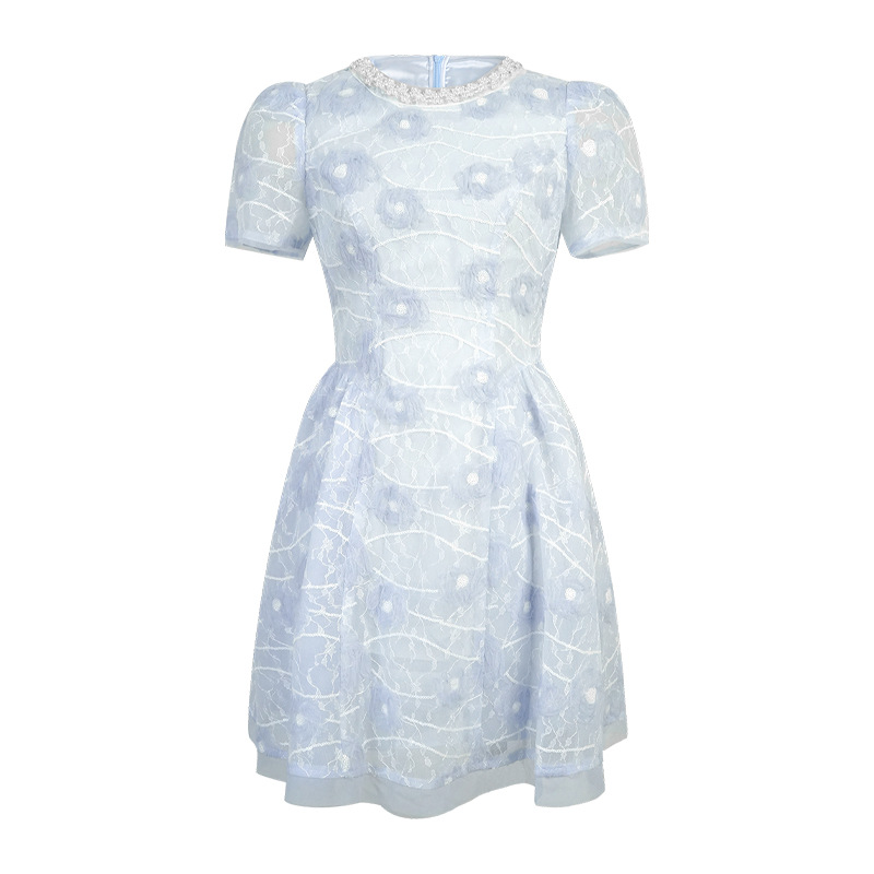 款式:連身裙顏色:藍色面料名稱:梭織主布:95%聚酯纖維 5%氨綸網紗:100%錦綸裡布:97%聚酯纖維 3%氨綸其他:有內裡