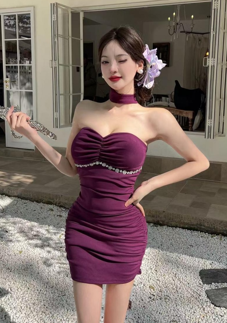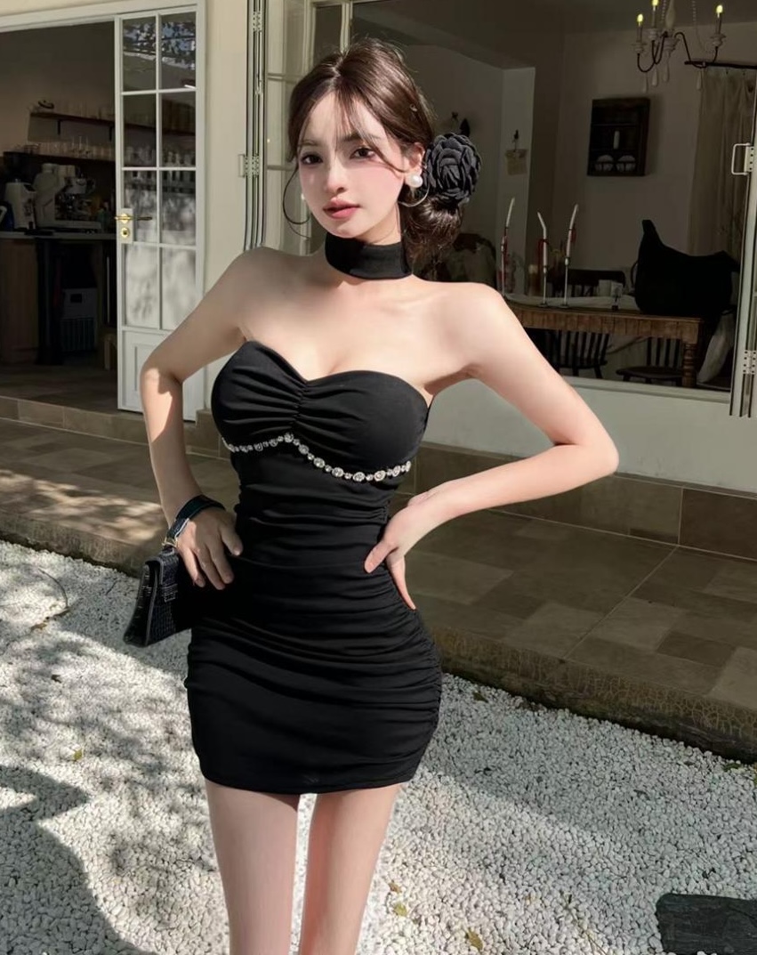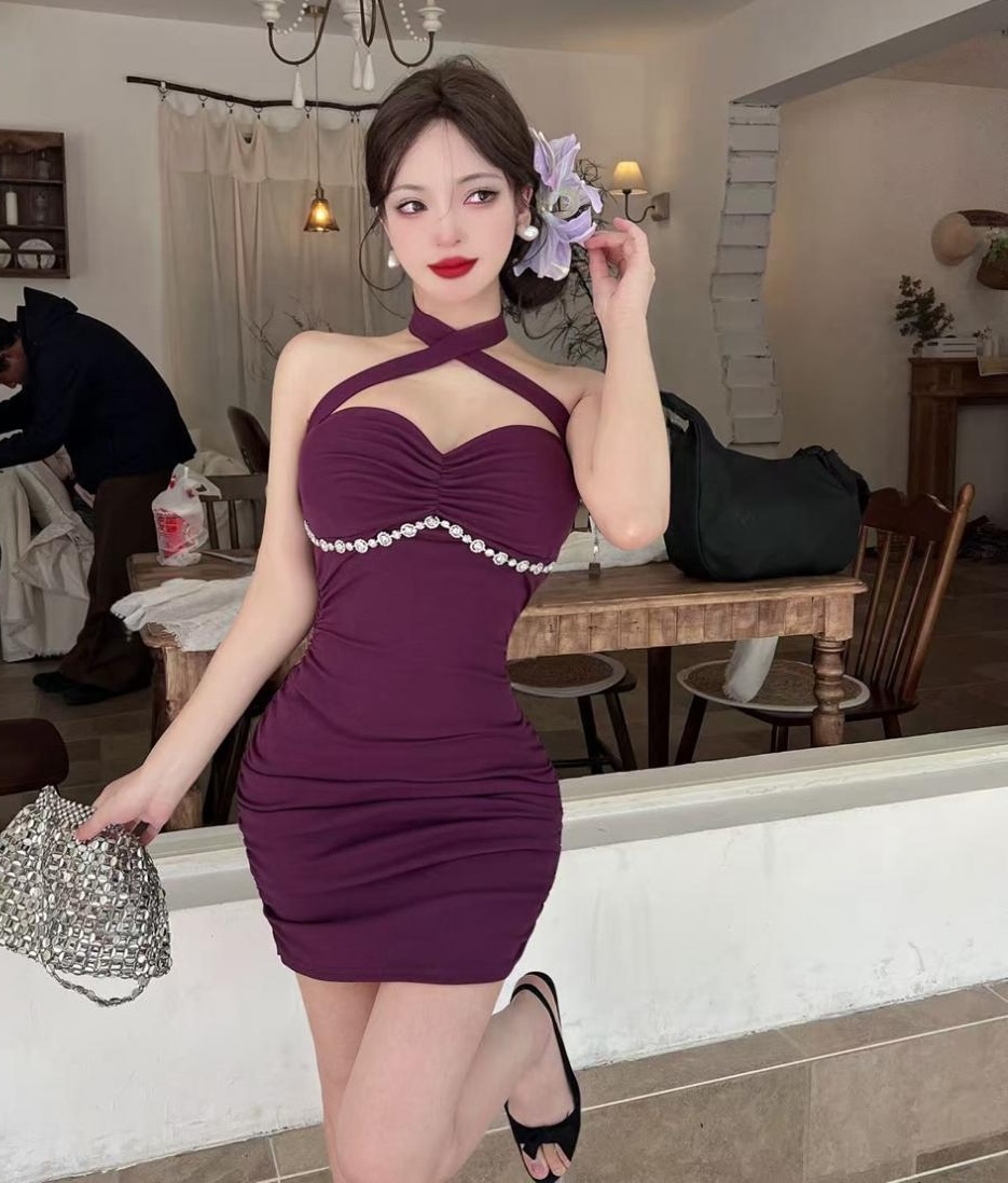 / 辣妹風性感掛脖修身收腰釘鑽連身裙-兩色